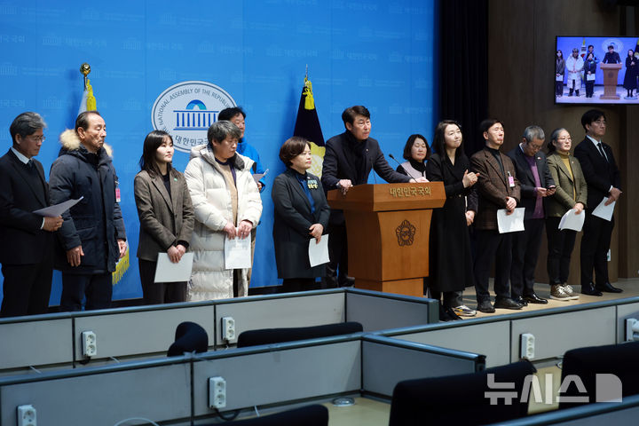 [서울=뉴시스] 고승민 기자 = 더불어민주당 김성회, 이훈기 의원, 정춘생 조국혁신당 의원, 국가폭력 피해자 유가족들이 30일 서울 여의도 국회 소통관에서 진실화해를위한과거사정리기본법 본회의 통과 환영 성명 발표 기자회견을 하고 있다. 2026.01.30. [email protected]