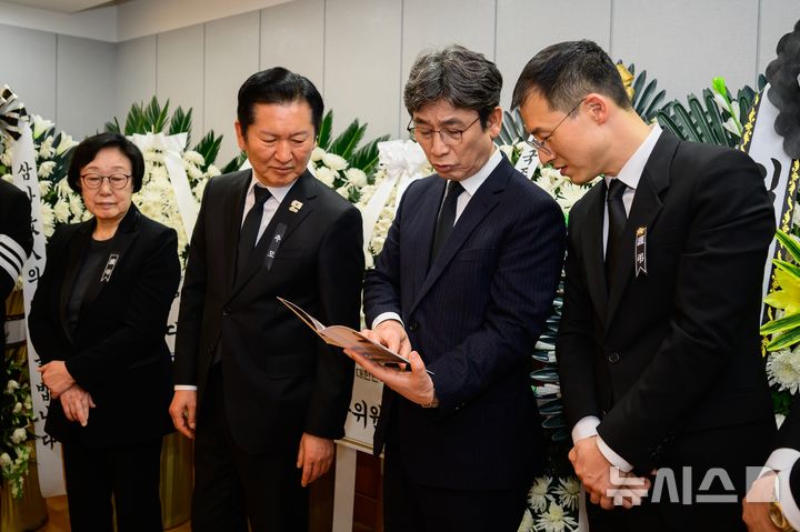 [서울=뉴시스] 사진공동취재단 = 30일 서울 종로구 서울대학교병원 장례식장에 마련된 고(故) 이해찬 전 국무총리의 빈소에서 한명숙 전 국무총리, 정청래 더불어민주당 대표, 유시민 작가, 김상욱 더불어민주당 의원이 조문객을 맞이하고 있다. 2026.01.30. [email protected]
