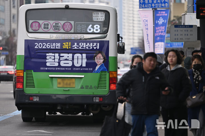 [광주=뉴시스] 이영주 기자 = 제9회 전국동시지방선거와 관련해 정당·후보명 현수막 등 설치가 금지되는 2월3일을 나흘 앞둔 30일 광주 서구 유·스퀘어종합버스터미널 버스승강장에서 광주지역 지방선거 출마 입지자들의 정당·후보명 광고판이 달린 시내버스가 다니고 있다. 2026.01.30. [email protected]