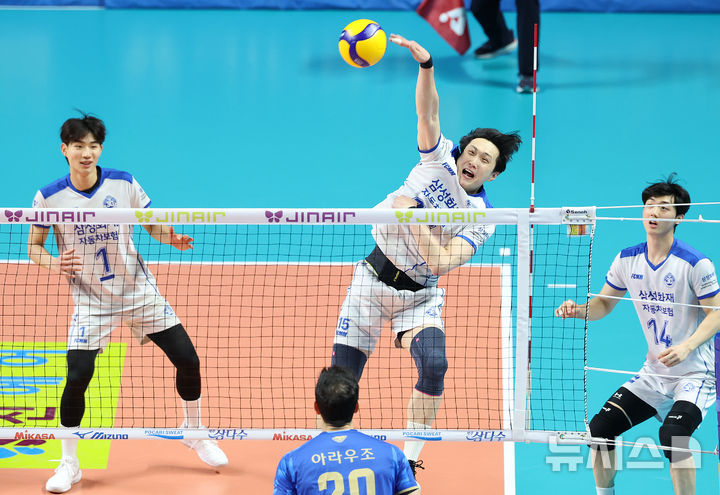 [서울=뉴시스] 이영환 기자 = 30일 오후 서울 중구 장충체육관에서 열린 2025-2026 V리그 우리카드 우리WON과 삼성화재 블루팡스의 경기, 삼성화재 손현종이 공격을 하고 있다. 2026.01.30. [email protected]