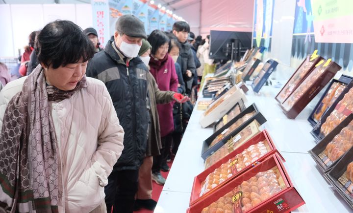 [영동=뉴시스] 31일 오후 충북 영동군 영동읍 영동천 하상주차장에서 ‘2026 영동곶감축제’가 열리고 있다. 축제는 내달 1일까지 이어진다. 이 지역 49개 농가가 차려놓은 임농특산물 판매장에서 방문객들이 품질 좋은 영동 곶감을 고르고 있다. (사진=영동군 제공) 2026.01.31. [email protected]
