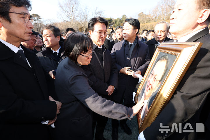 [세종=뉴시스] 강종민 기자 = 한 시민이 31일 세종시 은하수공원에서 열린 고 이해찬 전 총리의 안장식에서 영정사진을 쓰다듬고 있다. 2026.01.31. [email protected]