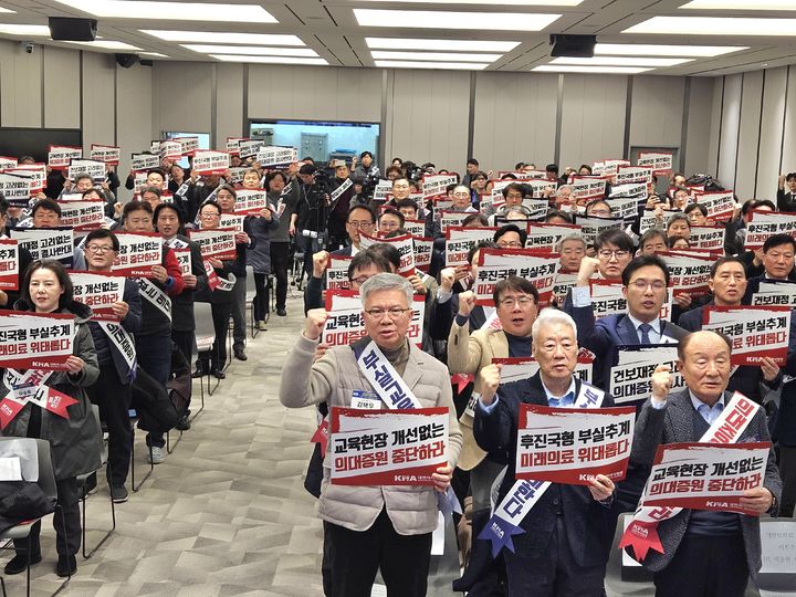 [서울=뉴시스] 정병혁 기자 = 김택우 대한의사협회장을 비롯한 참석자들이 31일 서울 용산구 대한의사협회에서 열린 합리적 의대정원 정책을 촉구하는 전국의사대표자대회에서 구호를 외치고 있다. (사진=대한의사협회 제공) 2025.01.31. [email protected] *재판매 및 DB 금지
