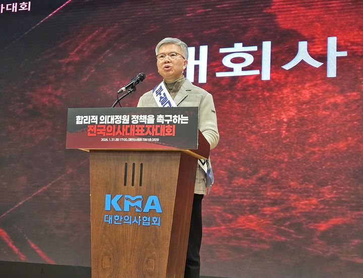 [서울=뉴시스] 정병혁 기자 = 김택우 대한의사협회장이 31일 서울 용산구 대한의사협회에서 열린 합리적 의대정원 정책을 촉구하는 전국의사대표자대회에서 개회사를 하고 있다. (사진=대한의사협회 제공) 2025.01.31. [email protected] *재판매 및 DB 금지