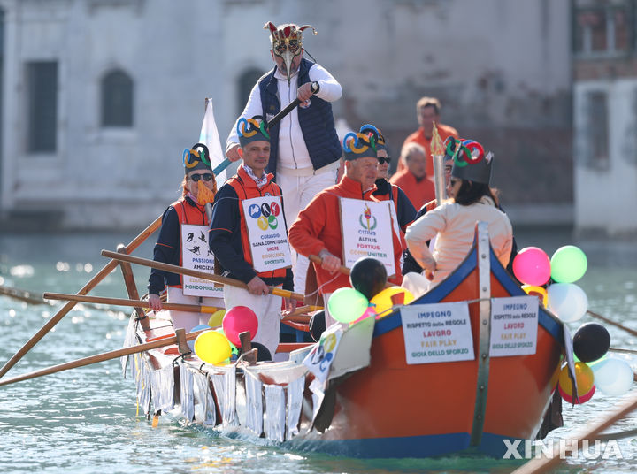 [베네치아=신화/뉴시스] 1일(현지 시간) 이탈리아 베네치아에서 열린 베네치아 카니발 수상 퍼레이드에서 올림픽 구호 주제의 복장을 한 사람들이 퍼레이스를 펼치고 있다. 올해 베네치아 카니발은 지난달 31일 개막해 2월 17일까지 이어지며 제25회 밀라노 코르티나·담페초 동계올림픽은 6일부터 22일까지 열린다. 2026.02.02.