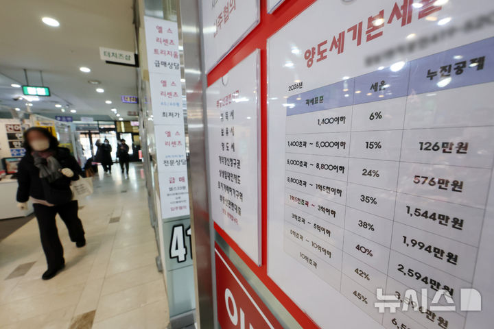 법원 등기정보광장에 따르면 지난해 12월 서울 집합건물 증여 등기 신청 건수는 1054건으로, 2022년 12월(2384건) 이후 가장 많았다. 사진은 이날 서울 송파구의 한 공인중개사사무소에 양도세 기본세율 안내문이 게시된 모습. 2026.02.02. [email protected]