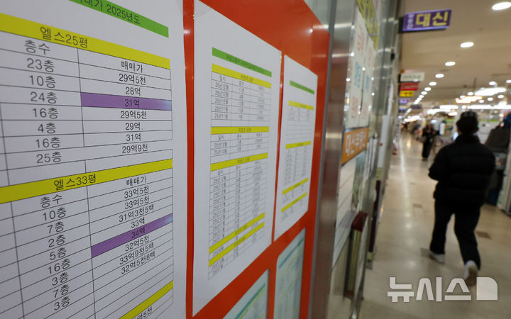 [서울=뉴시스] 조성우 기자 = 한강 이남 11개구의 중소형 아파트 평균 가격이 18억원을 돌파한 가운데 2일 서울 송파구의 한 공인중개사사무소에 국토교통부 아파트 실거래가 자료가 게시돼 있다.