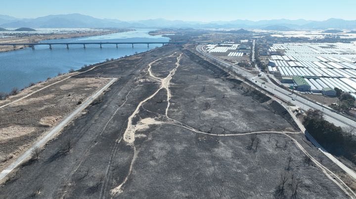 [창원=뉴시스] 강경국 기자 = 지난 2일 오후 경남 창원시 의창구 대산면 일동리 수산대교 아래 갈대밭에서 불이 나 갈대밭이 시커멓게 소실돼 있다. (사진=창원시청 제공). 2026.02.03. [email protected]