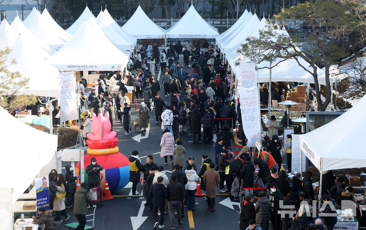 [서울=뉴시스] 김선웅 기자 = 3일 서울 강남구청에서 열린 2026 강남구 설맞이 직거래 장터에서 고객들이 상품을 구매하고 있다.