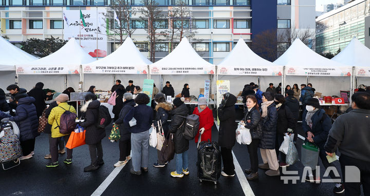 [서울=뉴시스] 김선웅 기자 = 3일 서울 강남구청에서 열린 2026 강남구 설맞이 직거래 장터에서 고객들이 상품을 구매하기 위해 줄을 서고 있다.