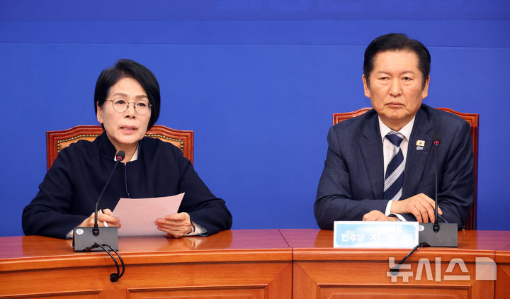 [서울=뉴시스] 김금보 기자 = 최민희 더불어민주당 의원이 3일 오후 서울 여의도 국회에서 ‘1인1표제’ 당헌 개정안 중앙위원회 가결에 대한 기자회견을 하고 있다. 2026.02.03. [email protected]