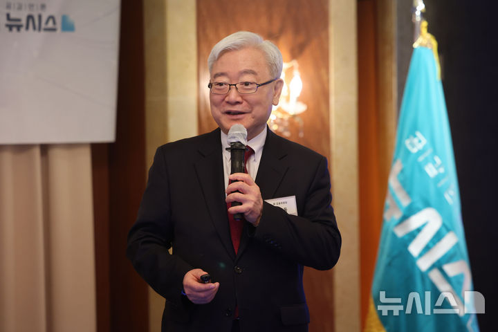 [서울=뉴시스] 권창회 기자 = 김석동 전 금융위원장이 4일 오전 서울 중구 롯데호텔에서 열린 제1기 뉴시스 금융 아카데미 졸업식에서 '미래를 개척하는 한민족 DNA'를 주제로 강연하고 있다. 2026.02.04. [email protected]
