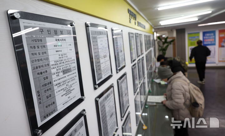 [서울=뉴시스] 김선웅 기자 = 지난해 고령자(55~64세) 고용률이 70%를 넘어섰다. 고용노동부 고령자 고용동향에 따르면 2025년 고령자 고용률은 직전년도보다 0.6% 상승한 70.5%로 1983년 통계 작성 이래 처음이다. 사진은 4일 서울 마포구 서울서부고용복플러스센터내 채용게시대의 모습. 2026.02.04. [email protected]