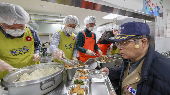 [서울=뉴시스] 권오을(왼쪽 두번째) 국가보훈부 장관이 4일 서울 용산구 서울연탄은행에서 열린 민·관·군이 함께하는 설맞이 찾아가는 보훈 따뜻한 한 끼 봉사에 참석해 배식 봉사를 하고 있다. (사진=국가보훈부 제공) 2026.02.04. [email protected] *재판매 및 DB 금지