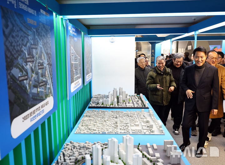 [서울=뉴시스] 최진석 기자 = 오세훈 서울시장이 4일 서울 중구 세종대로 서울도시건축전시관에서 열린 주택정책소통관 집들이 및 소통의 날 행사에서 모아 타운 관련 전시물을 살펴보고 있다. 2026.02.04. [email protected]