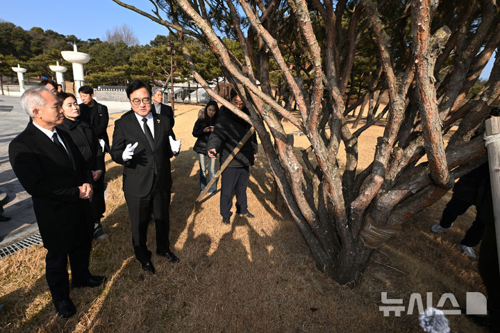 [광주=뉴시스] 이영주 기자 = 우원식 국회의장이 4일 오후 광주 북구 운정동 국립5·18민주묘지에서 양부남 국회의원 등을 향해 자신이 심은 기념식수를 설명하고 있다. 2026.02.04. [email protected]