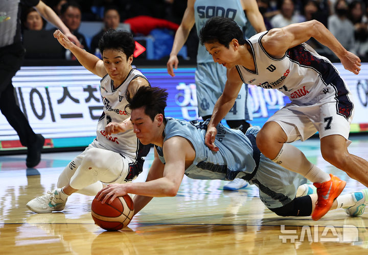 [고양=뉴시스] 김명년 기자 = 4일 경기 고양시 고양 소노아레나에서 열린 2025-2026 KBL 프로농구 고양 소노와 부산 KCC 이지스의 경기, 소노 이정현과 KCC 허훈, 허웅이 공에 몸을 던지고 있다. 2026.02.04. [email protected]
