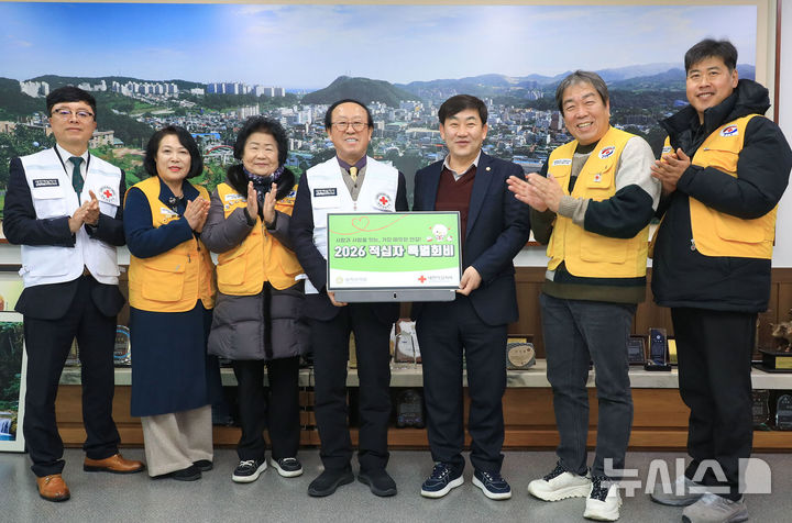 [삼척=뉴시스]홍춘봉 기자 = 강원 삼척시의회 권정복(오른쪽 세 번째) 의장이 5일 의장실에서 대한적십자사 강원특별자치도사에 적십자 특별회비를 전달하며 이웃사랑 실천에 동참하고 있다.(사진=삼척시의회 제공)[email protected]