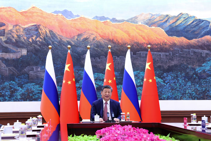 [베이징=AP/뉴시스] 신화사가 제공한 사진에 시진핑 중국 국가주석이 4일(현지 시간) 중국 베이징 인민대회당에서 블라디미르 푸틴 러시아 대통령과 화상 회담을 하고 있다. 2026.02.05.