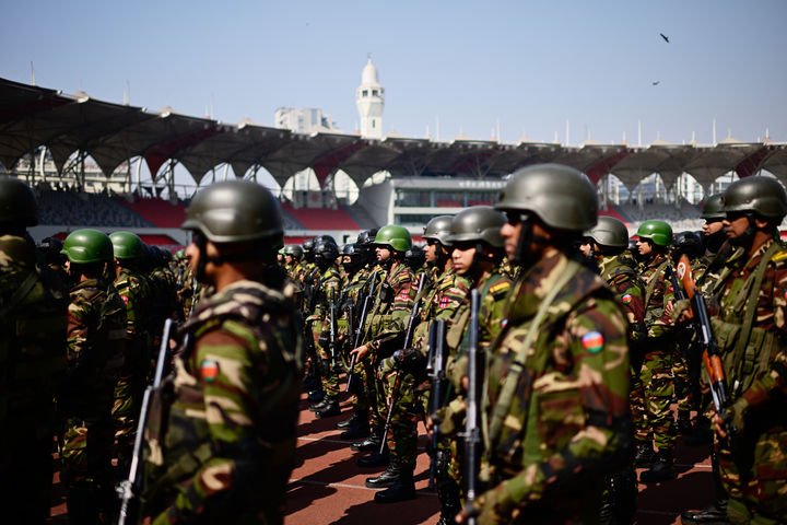 [다카=AP/뉴시스] 총선을 약 일주일 앞둔 5일(현지 시간) 방글라데시 다카 굴리스탄 국립경기장에 집결한 방글라데시 군인들이 치안 유지와 관련해 지휘관들의 지시를 받고 있다. 2026.02.05.