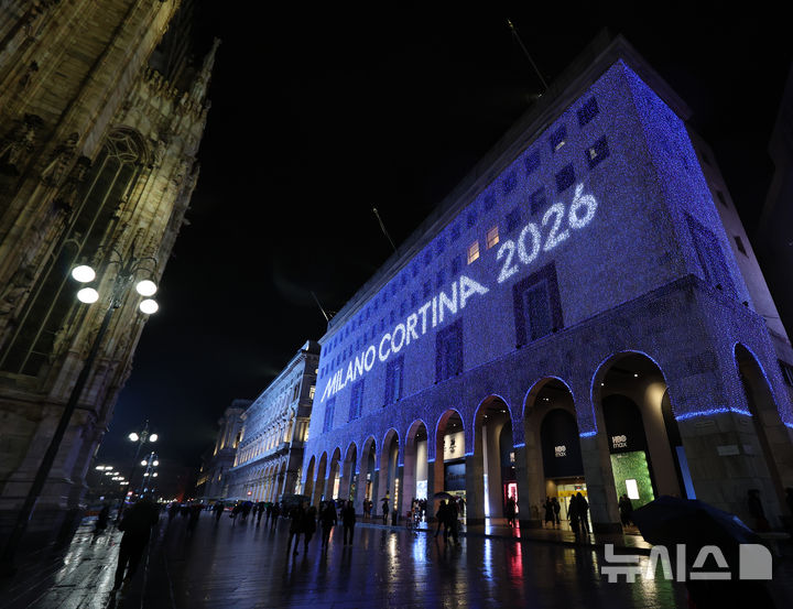 [밀라노=뉴시스] 박주성 기자 = 2026 밀라노-코르티나 담페초 동계올림픽 개막을 이틀 앞둔 4일(현지 시간) 이탈리아 밀라노 두오모 고딕 대성당 주변 건물에 동계올림픽을 나타내는 문구가 불을 밝히고 있다. 2026.02.04. [email protected]