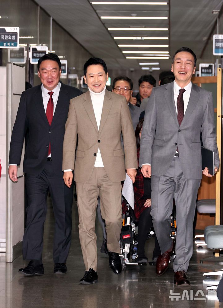 [서울=뉴시스] 조성봉 기자 = 장동혁 국민의힘 대표와 최고위원들이 5일 오전 서울 여의도 국회에서 열린 최고위원회의에 참석하고 있다. 왼쪽부터 정희용 사무총장, 장 대표, 김민수 최고위원. 2026.02.05. [email protected]