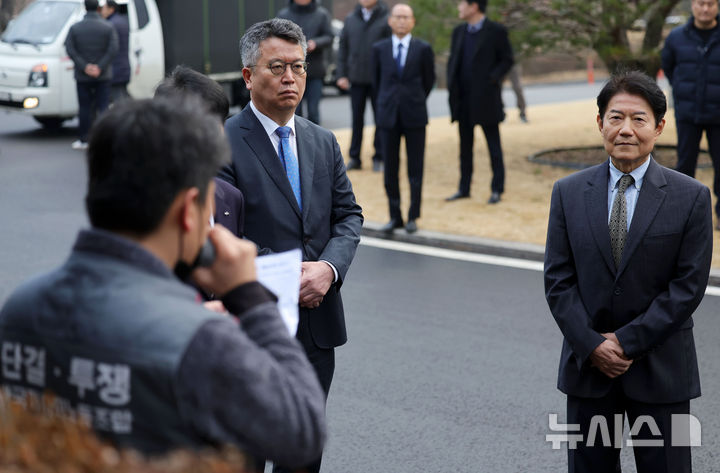 [과천=뉴시스] 홍효식 기자 = 우희종(맨 오른쪽) 한국마사회 신임 회장이 5일 오전 경기 과천시 한국마사회 본관 앞에서 한국마사회 노조의 투쟁으로 출근이 저지되고 있다. 2026.02.05. [email protected]
