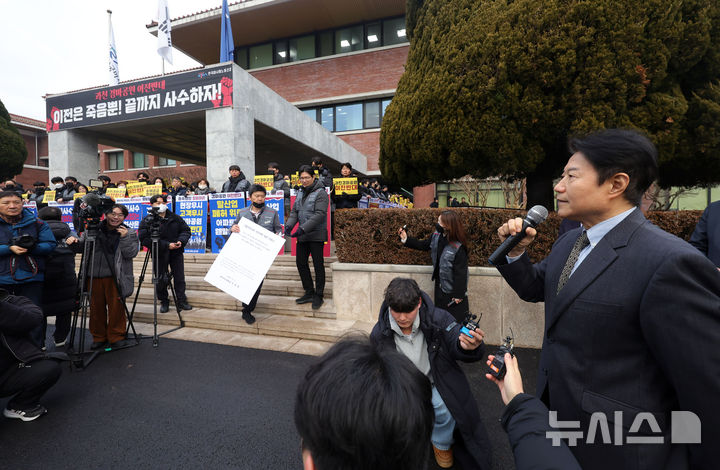 [과천=뉴시스] 홍효식 기자 = 우희종 한국마사회 신임 회장이 5일 오전 경기 과천시 한국마사회 본관 앞에서 한국마사회 노조의 투쟁으로 출근이 저지되자 입장을 밝히고 있다. 2026.02.05. [email protected]