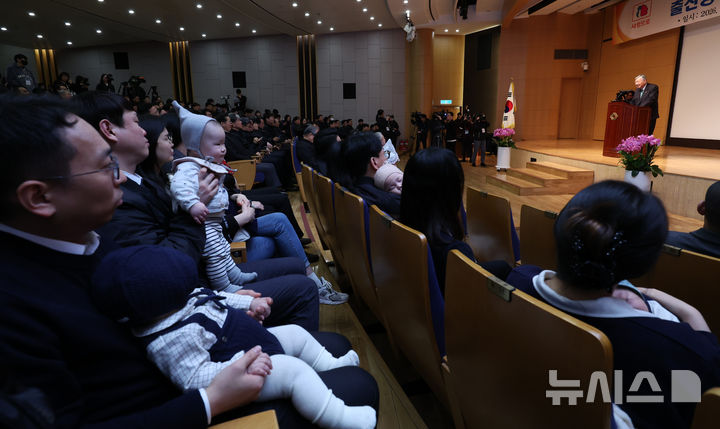 [서울=뉴시스] 이영환 기자 = 부영그룹 임직원들이 5일 오전 서울 중구 부영 태평빌딩에서 열린 부영그룹 시무식에 참석해 이중근 부영그룹 회장의 신년사를 듣고 있다. 2026.02.05. [email protected]