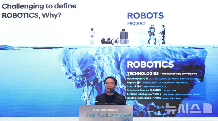 [서울=뉴시스] 김선웅 기자 = 현동진 현대자동차그룹 로보틱스랩장이 5일 서울 중구 웨스틴조선호텔에서 한국경영자총협회가 추최한 'AI시대, 새로운 기회와 도전' 제4회 한국최고경영자포럼에서 'AI와 로보틱스, 산업 경쟁력을 재정의하다!'를 주제로 강연을 하고 있다. 2026.02.05. [email protected]
