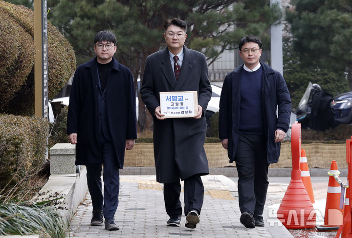 [서울=뉴시스] 김혜진 기자 = 김정철(가운데) 개혁신당 최고위원이 5일 오후 서울 양천구 서울남부지방검찰청에 출판기념회 현금 수수 의혹에 휩싸인 서영교 더불어민주당 의원에 대한 청탁금지법·정치자금법 위반 및 뇌물 혐의 고발장 제출을 위해 들어서고 있다. 2026.02.05. [email protected]