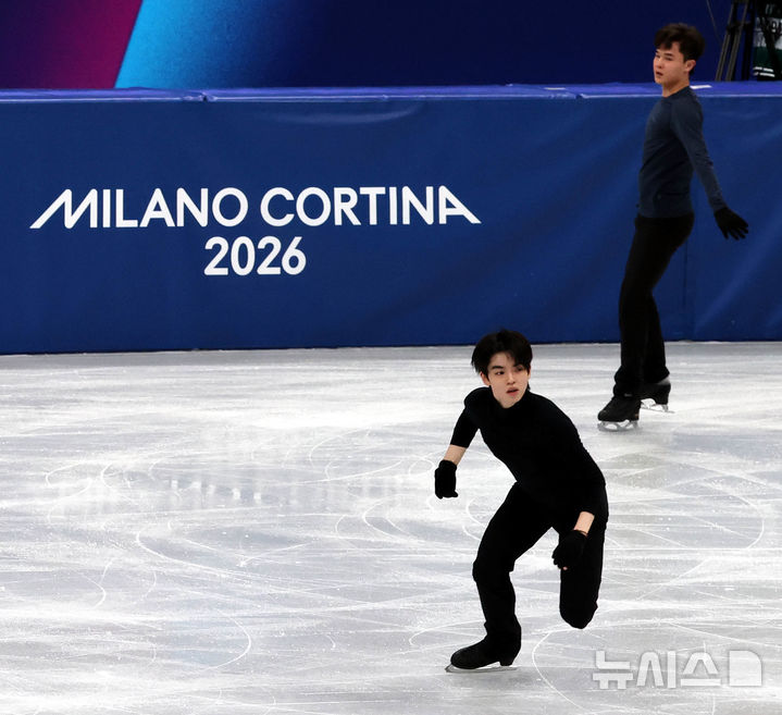 [밀라노=뉴시스] 박주성 기자 = 피겨스케이팅 차준환(앞쪽), 김현겸 5일(현지 시간) 이탈리아 밀라노 아이스 피겨스케이팅 아레나에서 훈련을 하고 있다. 2026.02.05. [email protected]