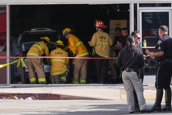 [로스앤젤레스=AP/뉴시스] 5일(현지 시간) 미 캘리포니아주 로스앤젤레스 웨스트우드 지역의 99랜치 마켓에 차량이 돌진해 현장에서 소방대원들이 작업하고 있다. LA 소방국은 이 매장에 은색 세단 한 대가 돌진해 3명이 현장에서 숨지고 6명이 부상했다고 밝혔다. 2026.02.06.