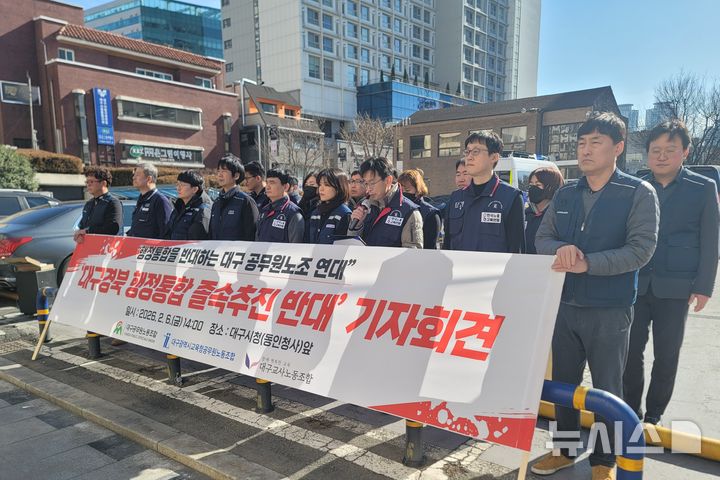 [대구=뉴시스] 이상제 기자 = 대구공무원노동조합, 대구시교육청공무원노동조합, 대구교사노동조합이 6일 대구 중구 동인청사 앞에서 '대구경북 행정통합 졸속추진 반대' 기자회견을 하고 있다. 2026.02.06. [email protected]