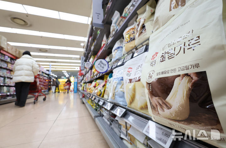 [서울=뉴시스] 황준선 기자 =  6일 서울 시내 한 대형마트에 밀가루가 진열돼 있다. 이재명 대통령의 물가 안정 주문과 담합 수사 여파 속에서 CJ제일제당과 대한제분, 사조동아원, 삼양사 등 제분·제당업계는 설탕 및 밀가루 가격을 4~6% 인하했다. 2026.02.06. [email protected]
