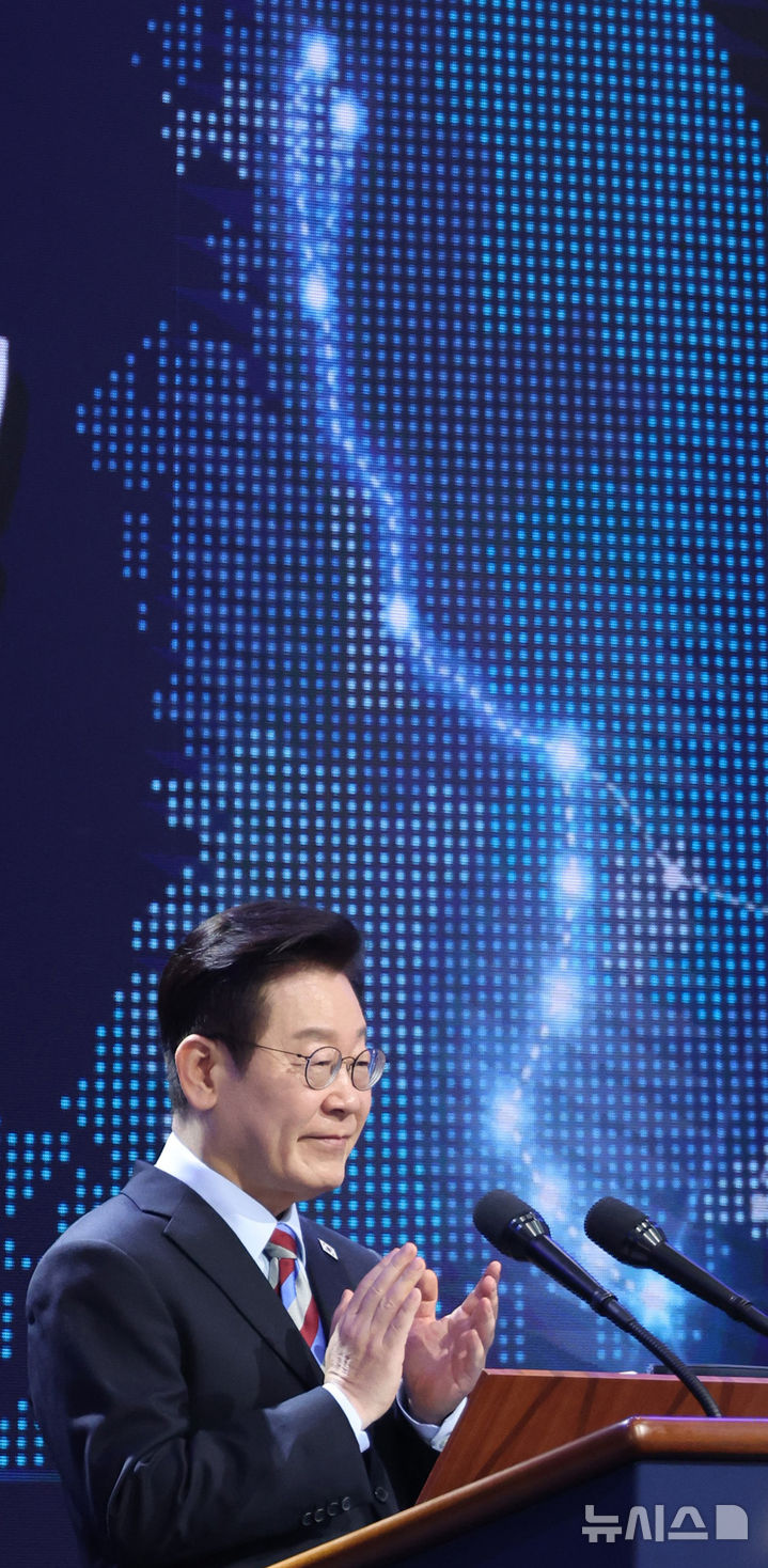 [거제=뉴시스] 최동준 기자 = 이재명 대통령이 6일 경남 거제시 견내량 인근에서 열린 남부내륙철도 착공식에서 기념사 중 박수를 치고 있다. (청와대통신사진기자단) 2026.02.06. [email protected]