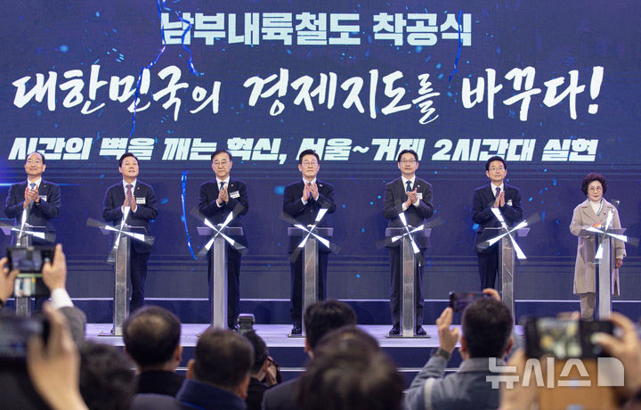 [거제=뉴시스] 최동준 기자 = 이재명 대통령이 6일 경남 거제시 견내량 인근에서 열린 남부내륙철도 착공식에서 참석자들과 기념 세리머니를 하고 있다.