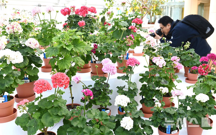 [수원=뉴시스] 김종택 기자 = 한파특보가 발효된 6일 경기 수원시 장안구 일월수목원 전시온실에서 열린 제라늄 기획전 '지금 우리는 봄'을 찾은 시민들이 다양한 색상의 제라늄 꽃을 살펴보고 있다. 2026.02.06. [email protected]