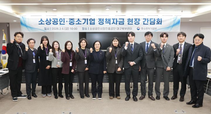 [서울=뉴시스] 한성숙 중소벤처기업부 장관이 6일 대구 북구 소상공인시장진흥공단 대구북부센터에서 열린 '소상공인·중소기업 정책자금 현장 간담회'에서 정책자금 집행 담당 실무자들과 기념촬영 하고 있다. (사진=중소벤처기업부 제공) 2026.02.06. [email protected] *재판매 및 DB 금지