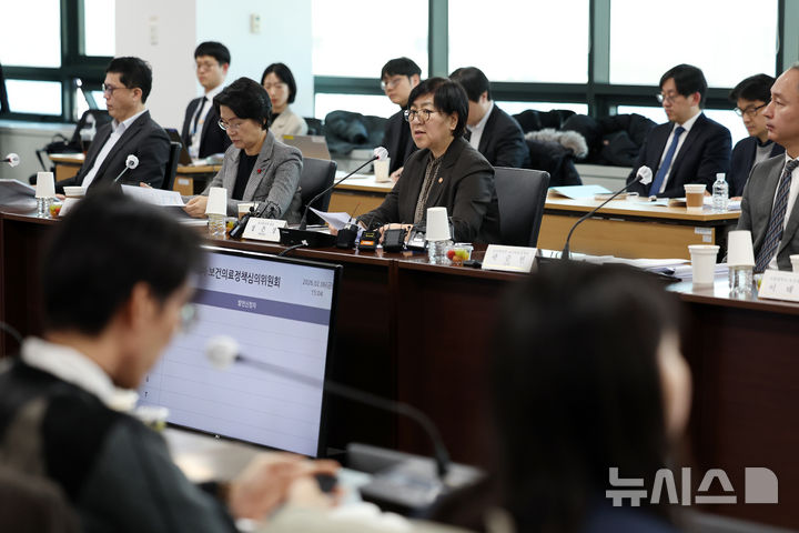 [서울=뉴시스] 조성우 기자 = 정은경(오른쪽 두 번째) 보건복지부 장관이 6일 오후 서울 서초구 국제전자센터에서 열린 제6차 보건의료정책심의위원회에서 발언하고 있다. 2026.02.06. [email protected]