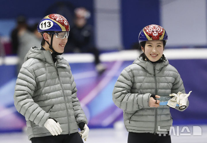 [밀라노=뉴시스] 김근수 기자 = 쇼트트랙 김길리와 임종언이 6일(현지 시간) 이탈리아 밀라노 아이스스케이팅 아레나 트레이닝 링크에서 훈련 도중 이야기를 나누고 있다. 2026.02.06. [email protected]