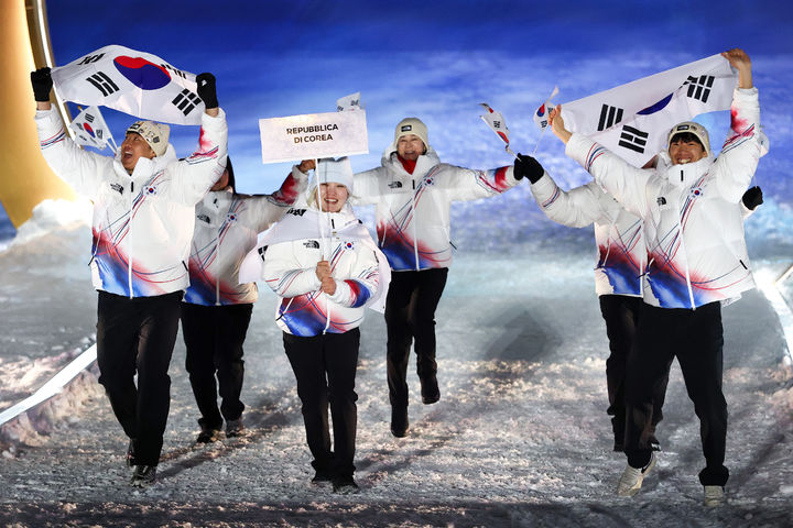 [리비뇨=AP/뉴시스] 대한민국 국가대표 선수단이 6일(현지 시간) 이탈리아 리비뇨의 스노파크에서 열린 2026 밀라노·코르티나담페초 동계올림픽 개막식에서 태극기를 흔들며 입장하고 있다. 2026.02.07.