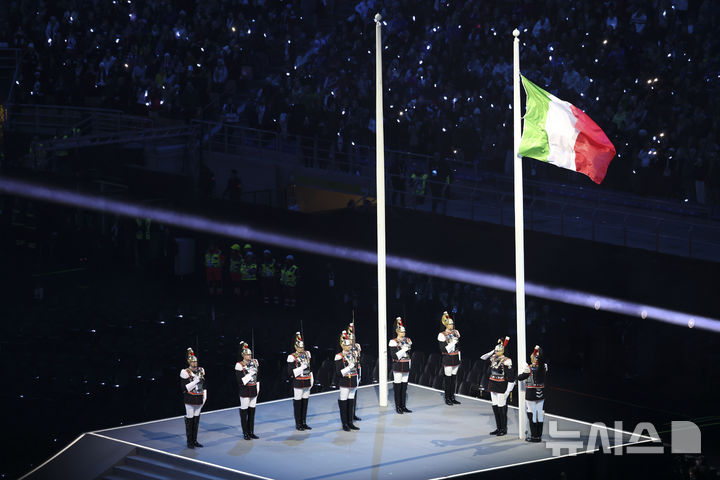 [밀라노=뉴시스] 김근수 기자 = 2026 밀라노·코르티나 담페초 동계올림픽 개막식이 열린 6일(현지 시각) 이탈리아 밀라노 산 시로 스타디움에서 이탈리아 국기가 게양되고 있다.