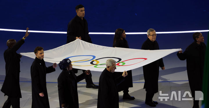 [밀라노=뉴시스] 박주성 기자 = 6일 (현지시간)이탈리아 밀라노 산시로 스타디움에서 열린 2026 밀라노·코르티나담페초 동계올림픽 개막식에서 오륜기가 들어오고 있다. 2026.02.06. [email protected]