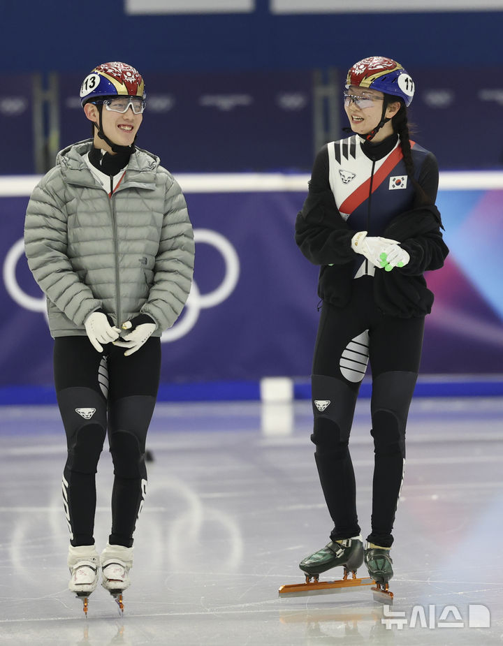 [밀라노=뉴시스] 김근수 기자 = 2026 밀라노·코르티나 담페초 동계올림픽 쇼트트랙 임종언과 심석희가 7일(현지 시간) 이탈리아 밀라노 아이스 스케이팅 아레나 연습 경기장에서 훈련 도중 이야기를 나누고 있다. 2026.02.07. [email protected]