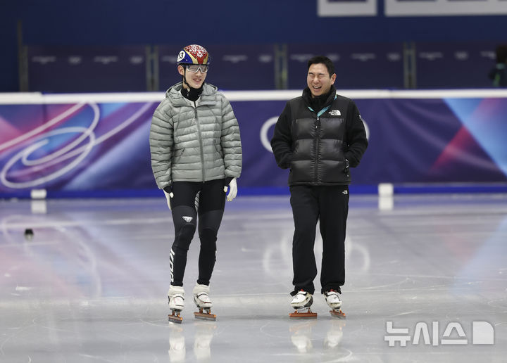 [밀라노=뉴시스] 김근수 기자 = 2026 밀라노·코르티나 담페초 동계올림픽 쇼트트랙 임종언이 7일(현지 시간) 이탈리아 밀라노 아이스 스케이팅 아레나 연습 경기장에서 코치와 이야기 나누고 있다. 2026.02.07. [email protected]