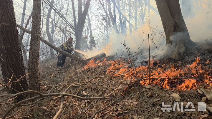 [경주=뉴시스] 8일 경북 경주시 문무대왕면 입천리 일원 야산에 화재가 발생한 가운데 소방 당국이 산불을 진압하고 있다.