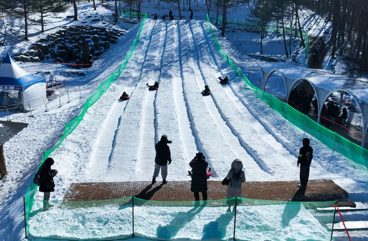 [태백=뉴시스]홍춘봉 기자 = 강원 태백산국립공원 당골광장 일원에서 지난달 31일 개막한 제33회 태백산 눈축제의 마지막 날인 8일 관광객들이 눈썰매를 타고 있다.(사진=태백시 제공)[email protected]