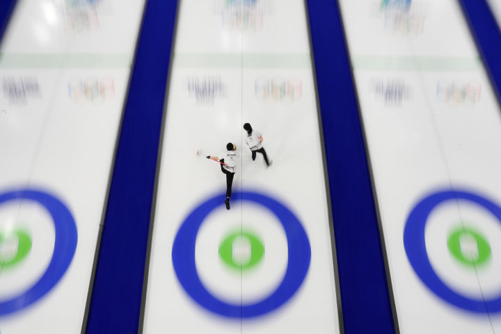 [코르티나담페초=AP/뉴시스] 한국 컬링 대표팀의 김선영과 정영석이 8일(현지 시간) 이탈리아 코르티나담페초의 코르티나 컬링 올림픽 스타디움에서 열린 2026 밀라노·코르티나 동계올림픽 컬링 믹스더블 라운드로빈 7차전에서 마리에 칼드비-하리 릴 조(에스토니아)와 경기하고 있다. 김선영-정영석 조가 9-2로 승리하면서 5패 끝 2연승을 올렸다. 2026.02.08.