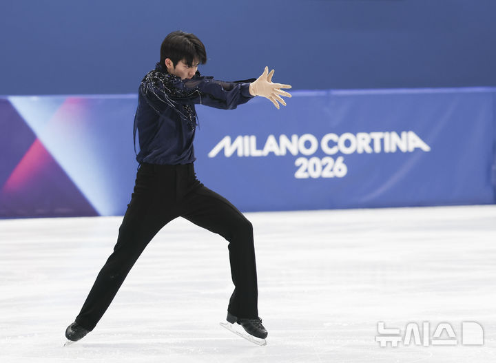 [밀라노=뉴시스] 김근수 기자 = 피겨스케이팅 팀 이벤트 남자 싱글 차준환이 7일(현지 시간) 이탈리아 밀라노 아이스 스케이팅 아레나 경기장에서 열린 2026 밀라노·코르티나 담페초 동계올림픽 팀 이벤트 단체전 남자 싱글 쇼트 프로그램에서 연기를 펼치고 있다. 2026.02.07. [email protected]